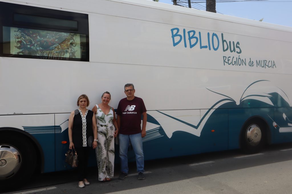 La concejal de Cultura, Carmen María López, y la bibliotecaria municipal, Mari Carmen Fernández, han visitado hoy en el paseo marítimo de la playa de La Puntica este autobús que anima a la lectura y acerca los libros a pie de playa cada verano desde que se puso en marcha en 1998.