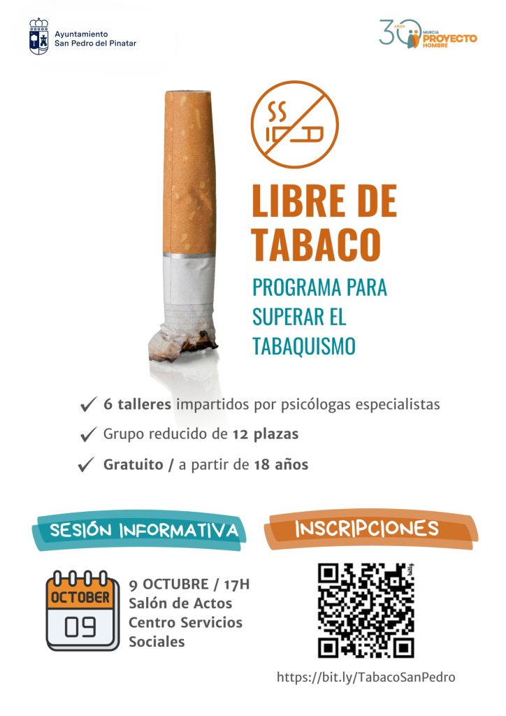 El Ayuntamiento de San Pedro del Pinatar y Proyecto Hombre unen sus fuerzas de nuevo en el “Programa de Superación del Tabaquismo”, un programa gratuito dirigido a adultos fumadores que residan en el municipio y que hayan tomado la decisión de dejar el tabaco.