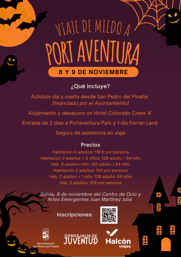 La concejalía de Juventud de San Pedro del Pinatar organiza una año más un viaje dirigido a jóvenes y familias para disfrutar del parque de atracciones PortAventura con motivo de la festividad de Halloween.