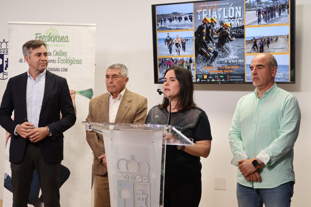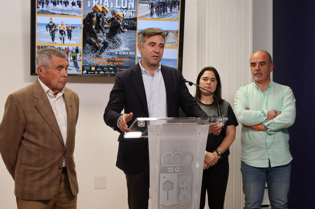 El alcalde de San Pedro del Pinatar, Pedro Javier Sánchez, la presidenta del 30 7 40, Cuqui Arenas, y el presidente de Trimurcia, Diego Calvo, han presentado hoy la décimo sexta edición de esta prueba, consolidada ya como una cita imprescindible para los amantes del triatlón en la Región.