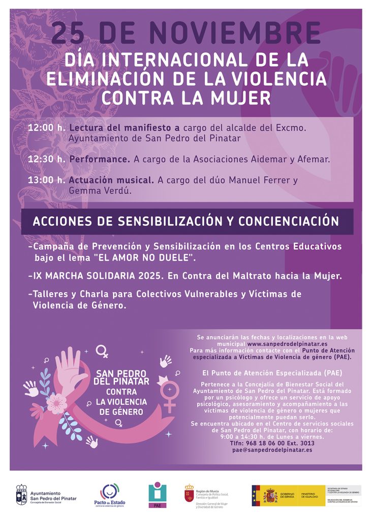 El acto concluirá con la actuación musical del dúo Manuel Ferrer y Gemma Verdú. Además, durante la mañana Radio Pinatar grabará un programa monográfico especial dedicado a la lucha contra la violencia de género, con testimonios, información y reflexiones sobre la realidad local y los recursos municipales.