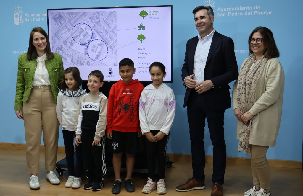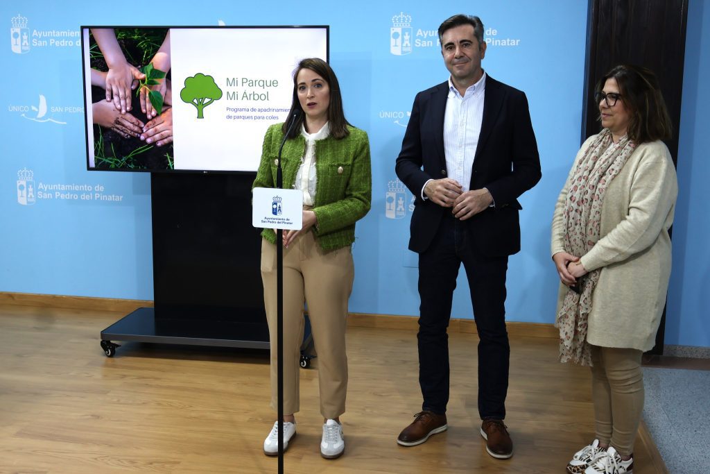 El alcalde de San Pedro del Pinatar, Pedro Javier Sánchez, y las concejalas de Parques y Jardínes, Mayca Egea, y Educación, María Dolores Nieto, han presentado hoy la iniciativa “Mi parque, mi árbol”, que se desarrollará en coordinación con los centros escolares.