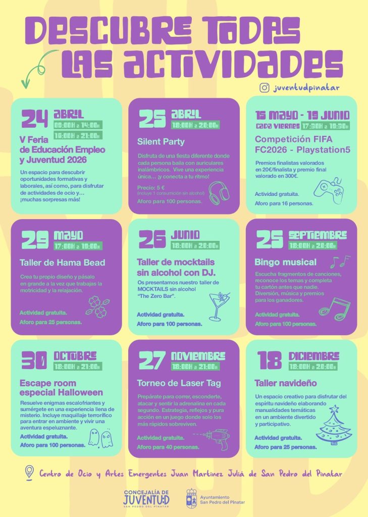 Todas las actividades se desarrollarán en el Centro de Ocio y Artes Emergentes Juan Martínez Julia, consolidando este espacio como punto de encuentro para el ocio juvenil en el municipio. Con esta iniciativa, el Ayuntamiento de San Pedro del Pinatar refuerza su compromiso con la juventud, ofreciendo alternativas de ocio saludables, accesibles y adaptadas a sus intereses.